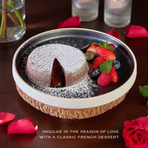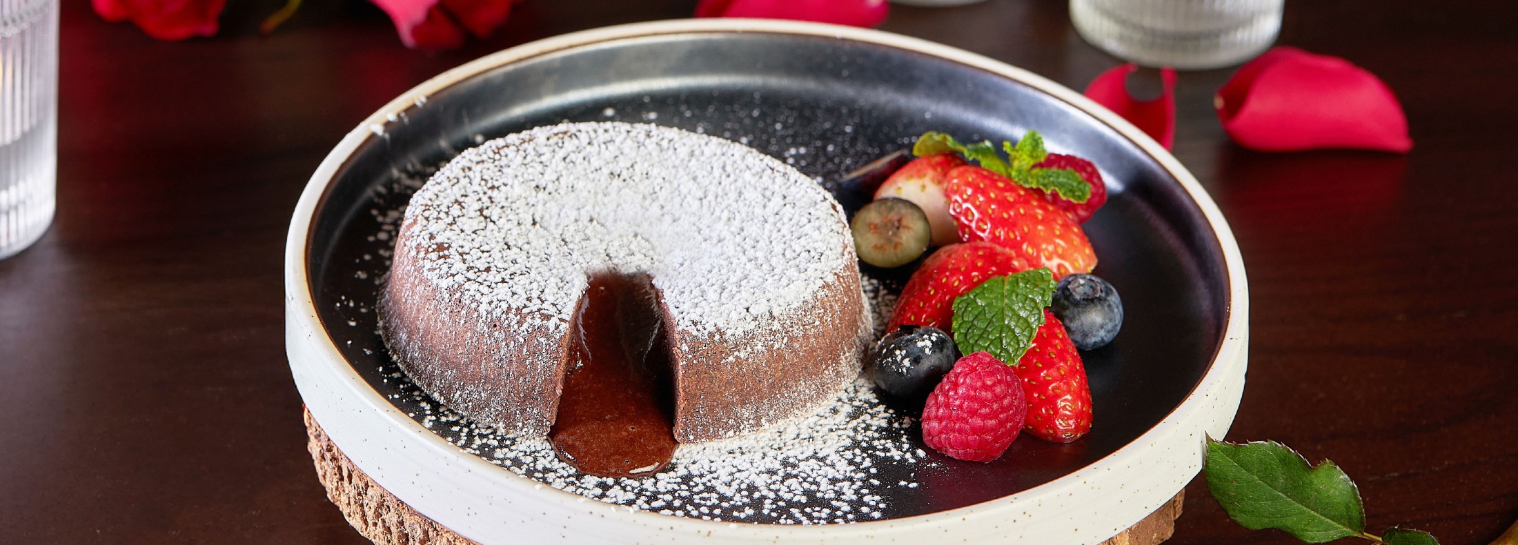 A classic French chocolate fondant made with premium Valrhona dark chocolate, revealing a warm, molten heart with every bite.