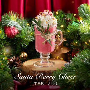 Santa Berry Cheer – Creamy Bailey’s with raspberry purée, pineapple, lime, and grenadine, delivering playful holiday sweetness.