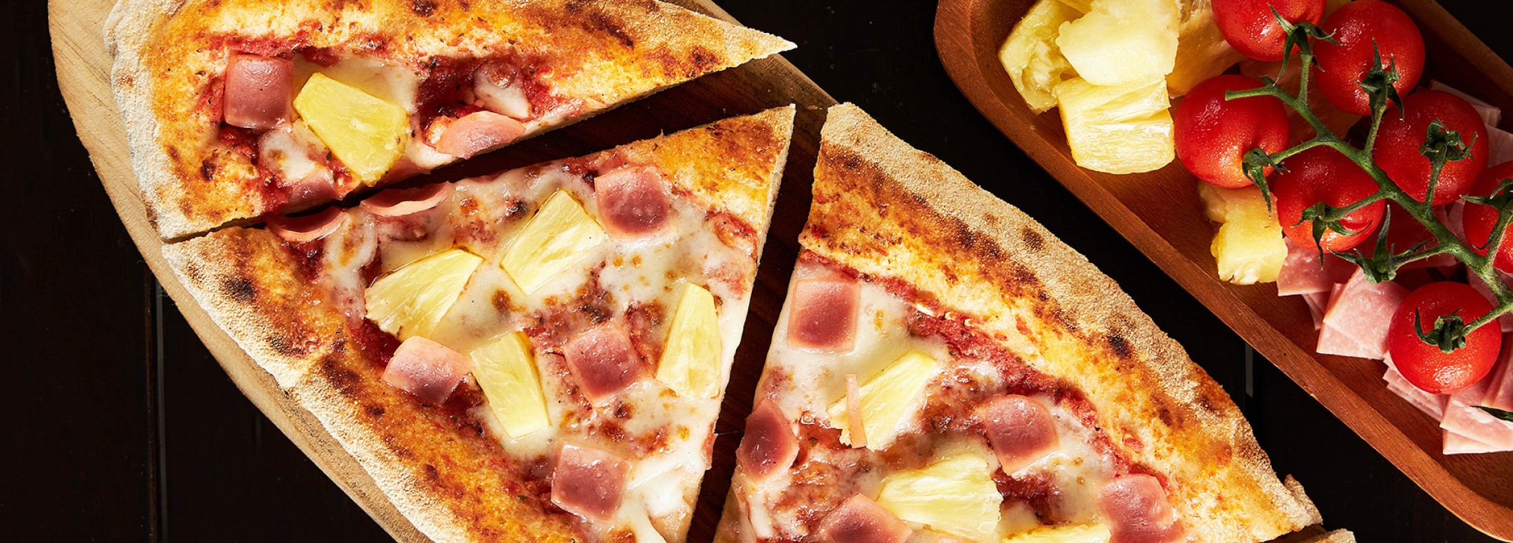 A special recipe thin and crispy flatbread pizza topped with generous slices of ham and sweet, juicy pineapple. Finished with rich, flavorful pizza sauce and melted, gooey cheese. Served hot from the oven.