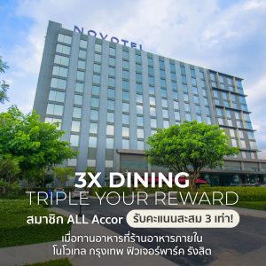 รับคะแนนสะสมเพิ่มขึ้น 3 เท่า ช่วงเวลาสุดคุ้มสำหรับสมาชิก ALL Accor เมื่อทานอาหารที่ โรงแรมโนโวเทล กรุงเทพ ฟิวเจอร์พาร์ค รังสิต ตั้งแต่วันที่ 10 พฤศจิกายน 2025 ถึง 22 มีนาคม 2569
